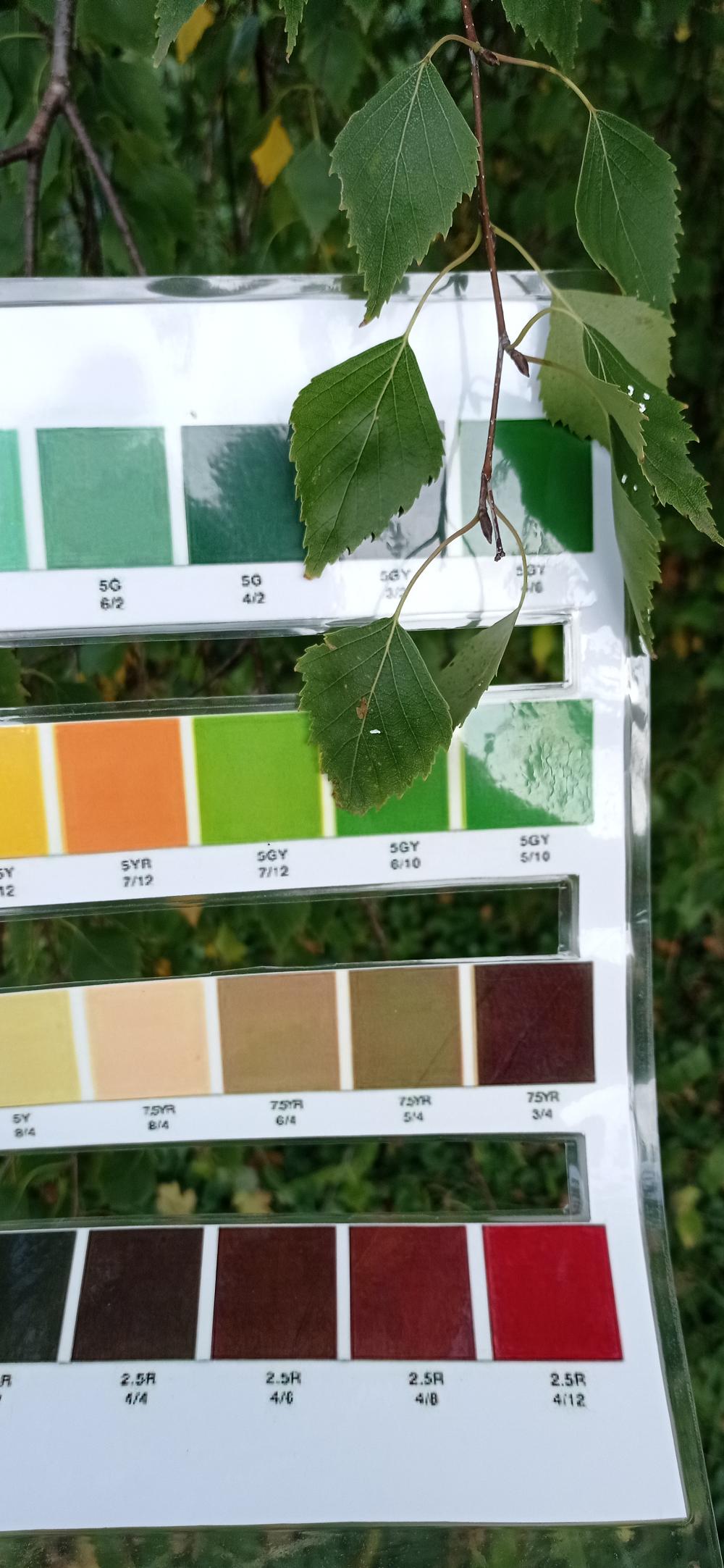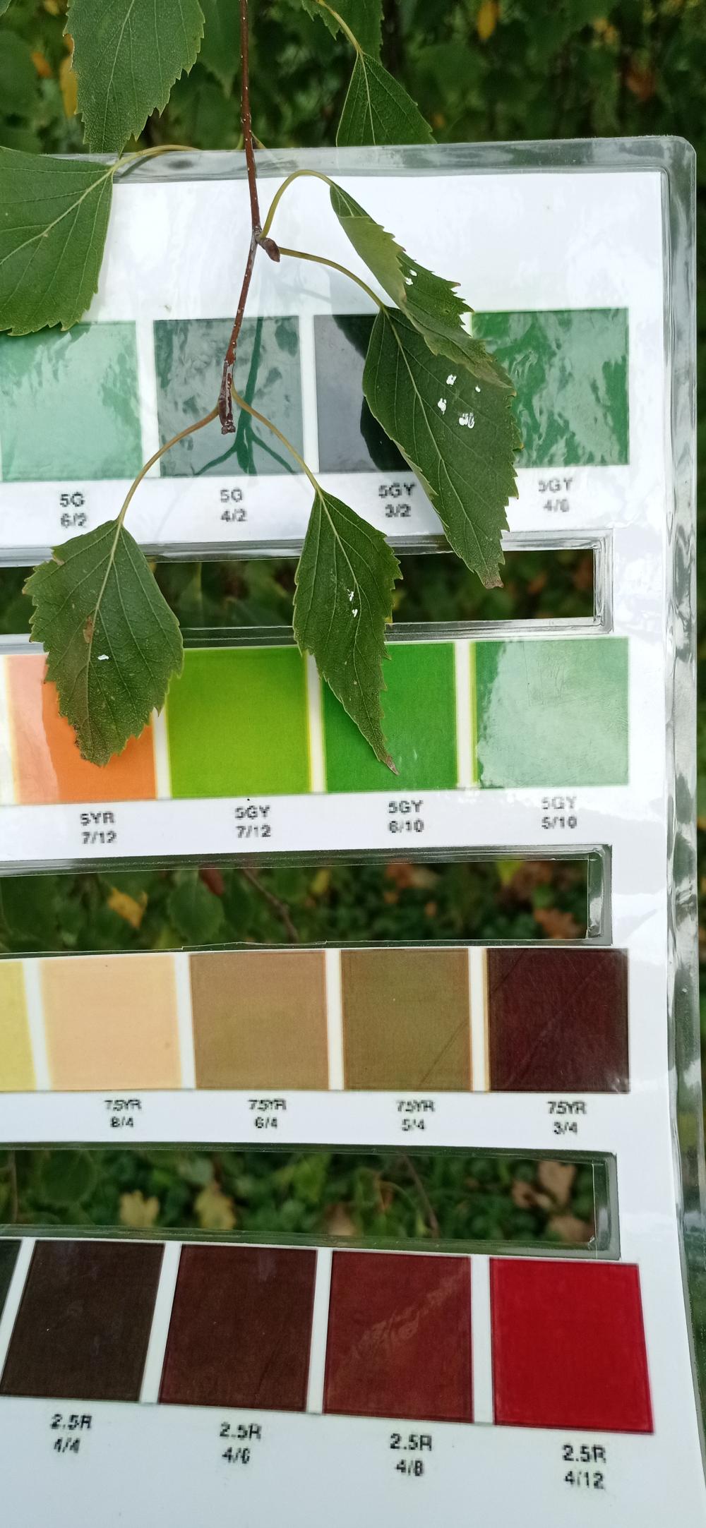 The leaves on our birch  have already started to turn yellow. But the leaves we are watching are still green. All four leaves are 5 GY 4/8.