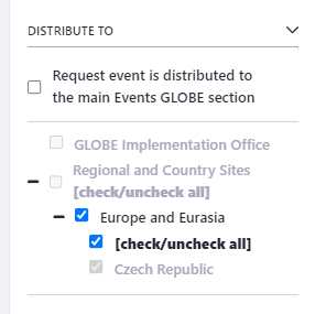 I would like to distribute it to the GOBE Europe and Eurasia page and from there to all countries in the region. I checked "distribute to Europe and Eurasia" - see print screen below. No one in the office received an approval request, so the event remains only on the GLOBE Czech page.