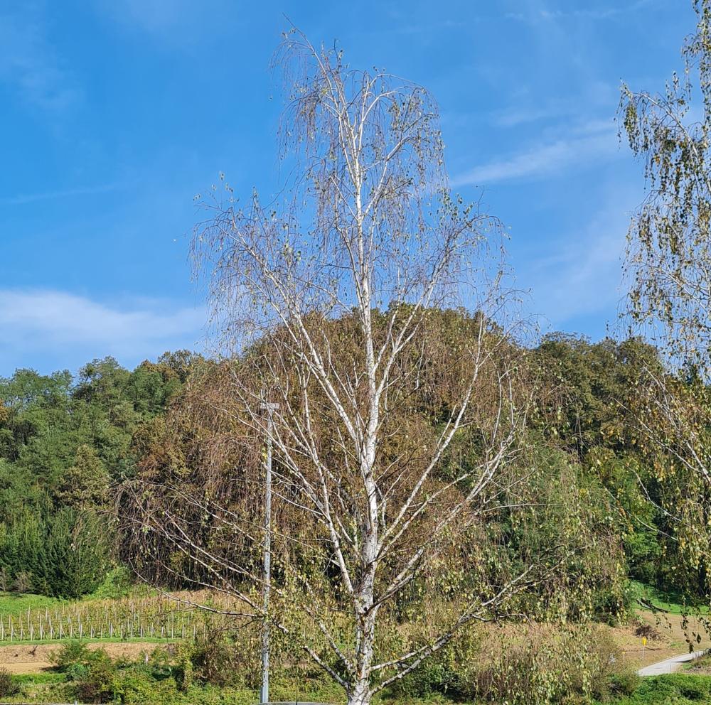 The other birch tree near the school in Macelj still has got a lot of leaves. The colour of them is 5GY 6/10.  The weather is sunny and warm with temperature around 19 degrees.