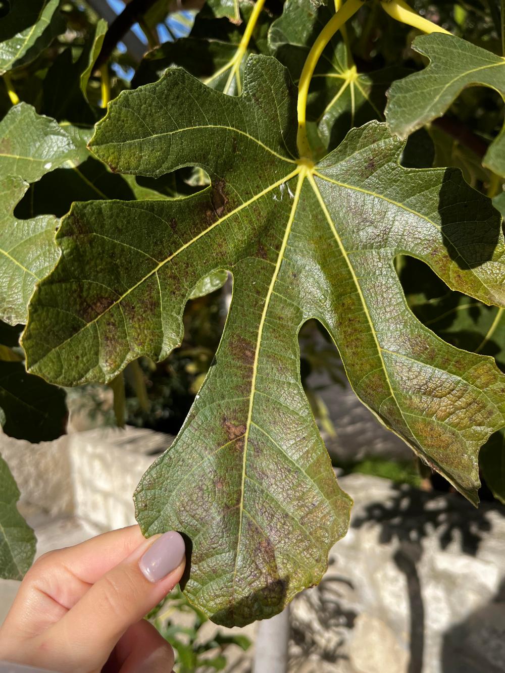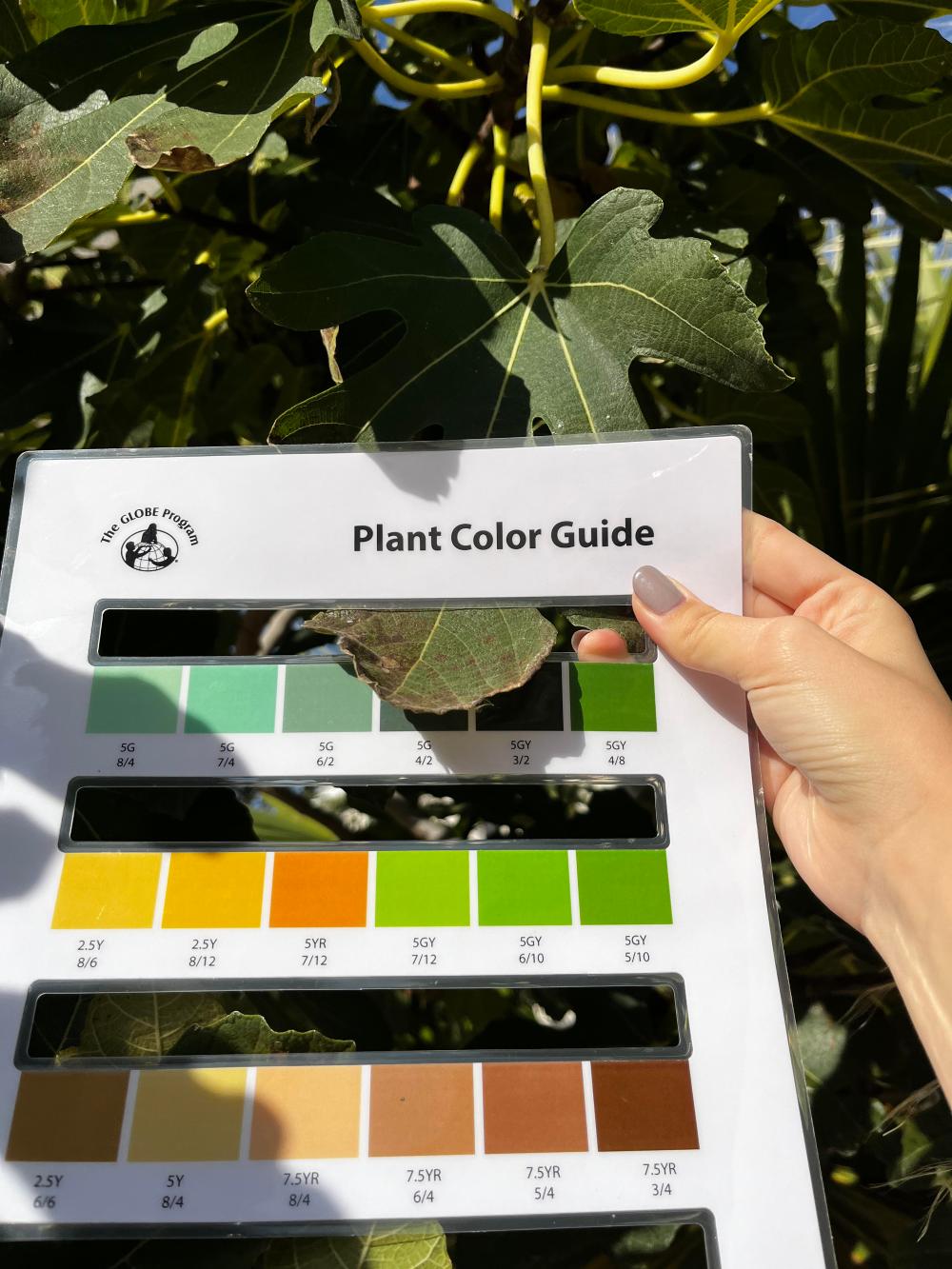 On 6th November 2024,  the color of 2 of the leaves on the fig were 5GY 3/2 and 2 leaves were 7.5YR 3/4.