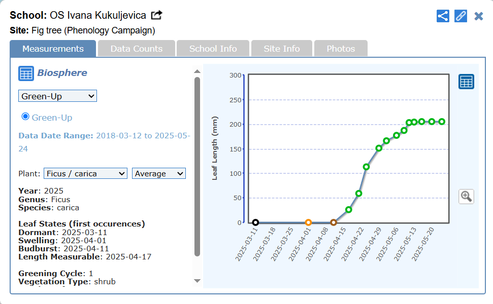The students analysed green-up of both fig trees. The tree in Rijeka had an earlier budburst (mid-March), and the leaves stopped growing earlier (early May). In comparison, the tree in Belišće had a later buburst (early April) and the leaves stopped growing in mid-May.